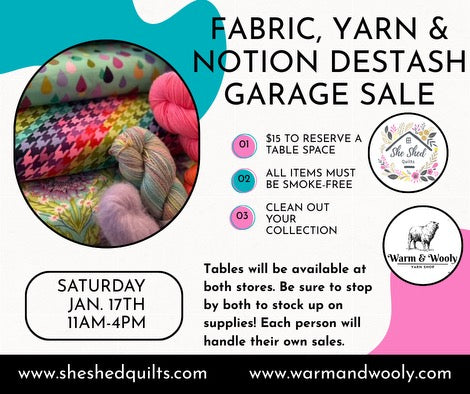 Looking to destash your craft collection? Rent a table at She Shed Quilts or Warm and Wooly for $15 and get rid of your extra supplies you arenât using.