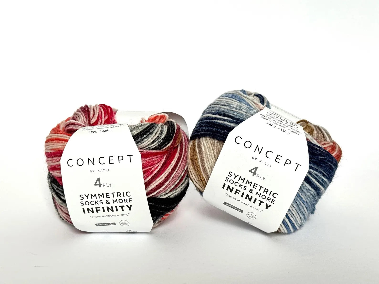 Katia Symmetric Socks is a self-patterning yarn designed especially for sock lovers who want perfectly matching pairs without the fuss. With its clever colour sequence, each ball allows you to knit two identical socks easily – no guesswork required. Simply follow the colour repeat and enjoy the satisfaction of a balanced, symmetric design every time.