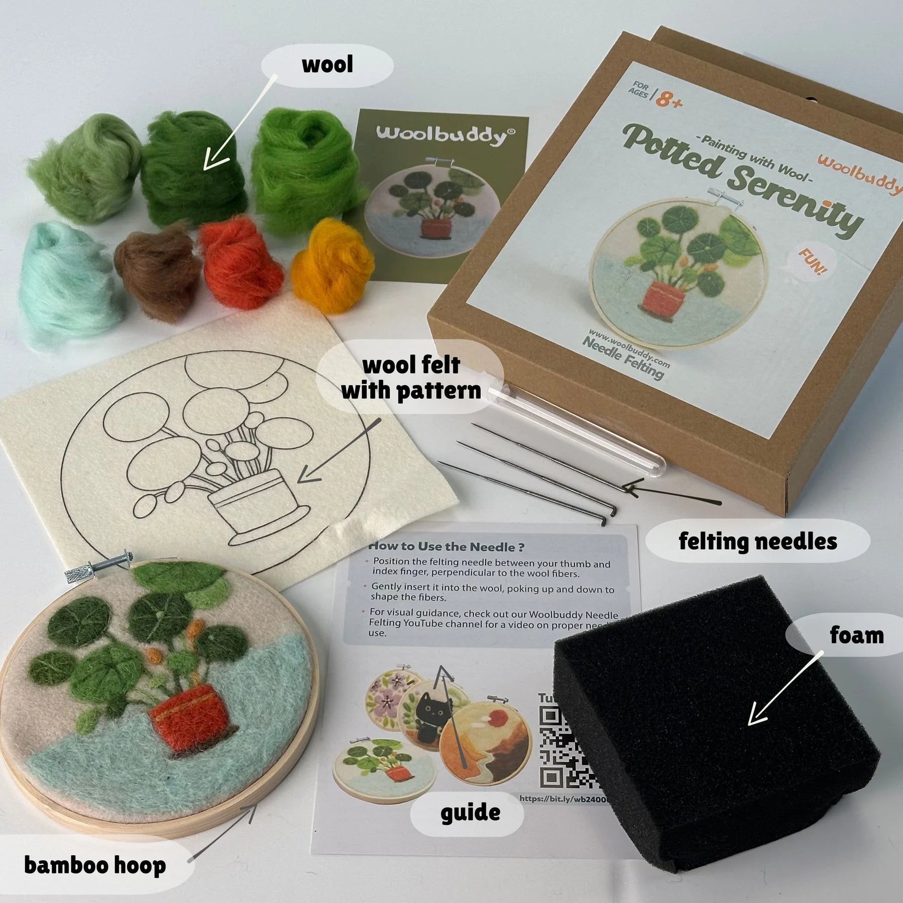 Unleash your creativity with the Painting with Wool - Potted Serenity kit by Woolbuddy. This beautiful felting kit lets you create a stunning design using the ancient art of needle felting. Whether you're a beginner or an experienced artist, this all-in-one kit provides everything you need to bring a colorful bloom to life.